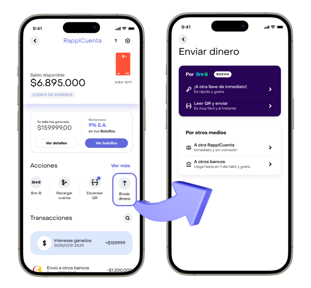 1. Toca el botón “Enviar dinero” desde tu RappiCuenta o Bre-B